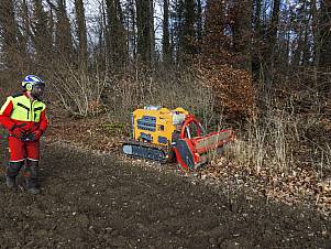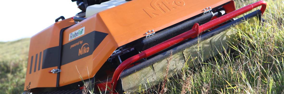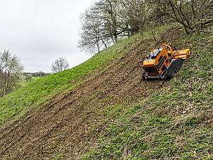 Der Rapid RoboFlail One P252 ermöglicht eine bislang ungeahnte Freiheit bei der Pflege von Grünflächen. Durch die Entkopplung der Maschine vom Bediener steht dieser immer an einem sicheren Ort. Nur die Maschine arbeitet im Risikobereich. - Und das an Hanglagen mit bis zu 55° Steigung.
